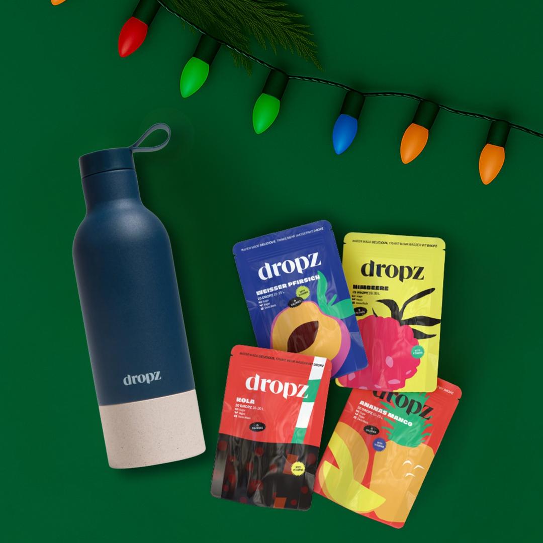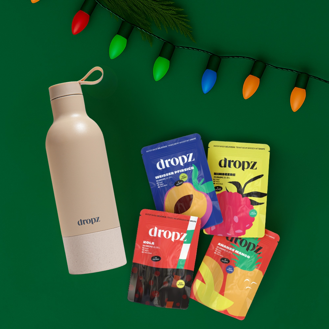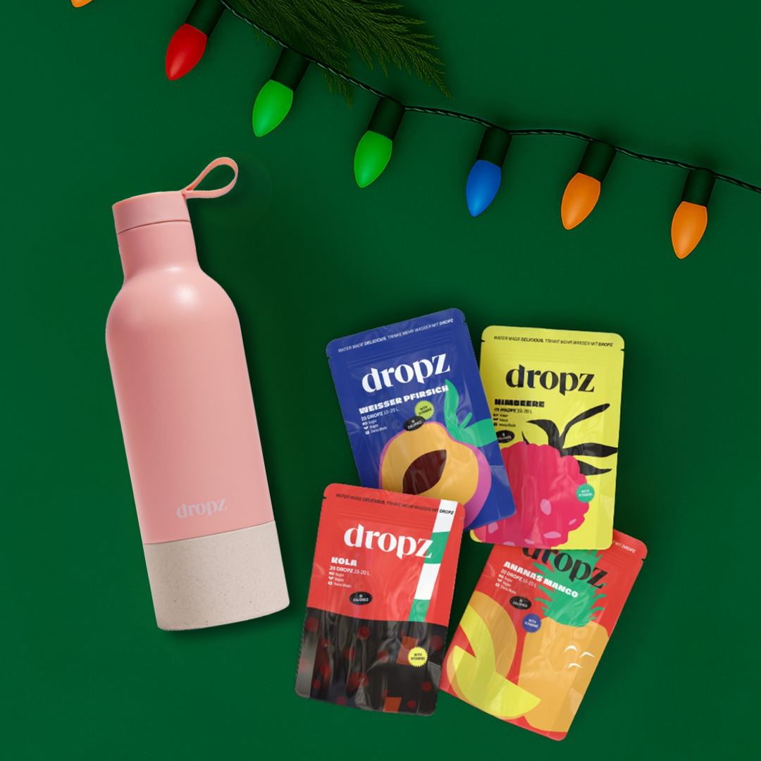 Le cadeau parfait pour tous ceux qui aiment l'hydratation stylĂ©e - notre set de NoĂ«l exclusif combine nos 4 parfums les plus populaires (cola, pĂȘche, ananas-mangue, framboise) avec la gourde Dropz (0,5 L).
